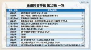 等級表は部位別に項目が整理されており、欠損の有無、機能障害の程度、検査数値の基準など、客観的に当てはめられる形で規定されています。